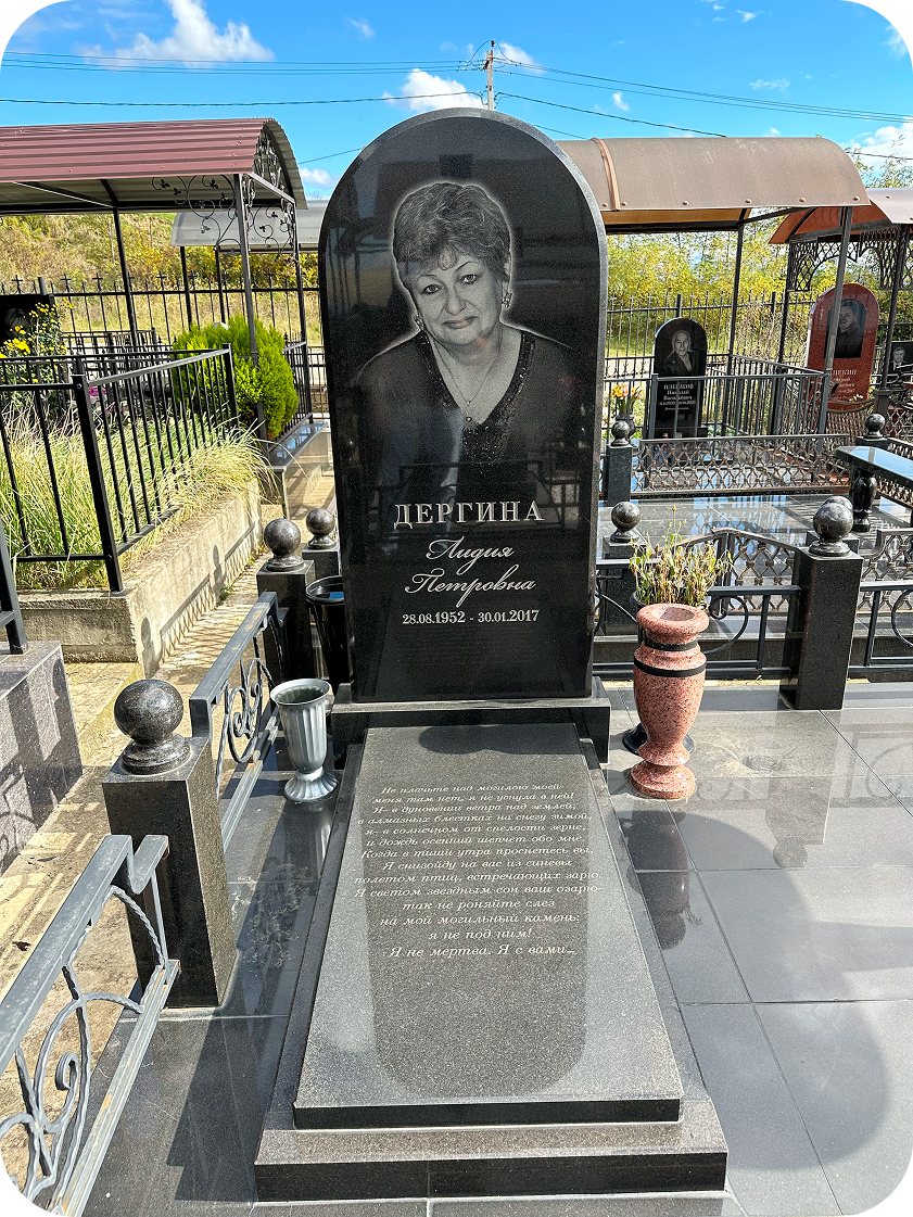 Памятник из гранита «Карелия» с плавным полукруглым завершением — символ мягкости, гармонии и вечного покоя. Закруглённая форма смягчает строгие линии камня, придавая всей композиции чувство уюта и завершенности.