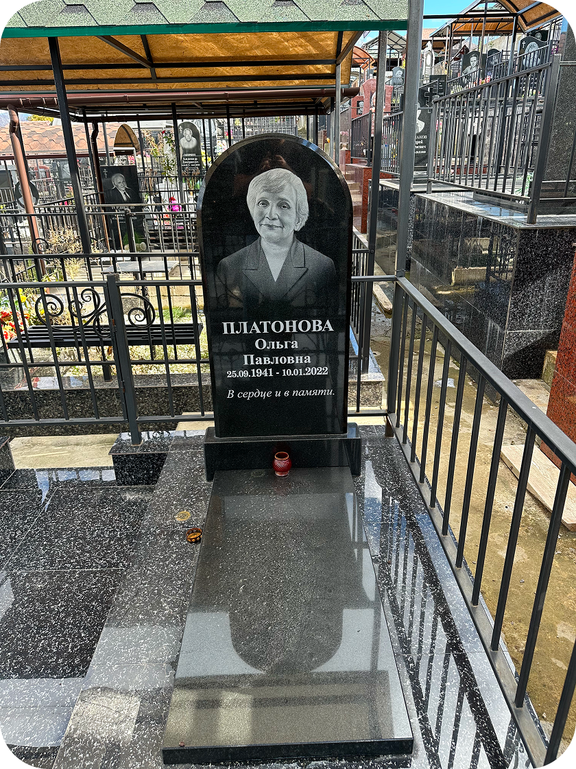 Изготовлен из прочного карельского гранита, отличающегося насыщенным черным цветом и долговечной полировкой. Этот материал надежно хранит гравировку и изображение, сохраняя красоту памятника на долгие годы.